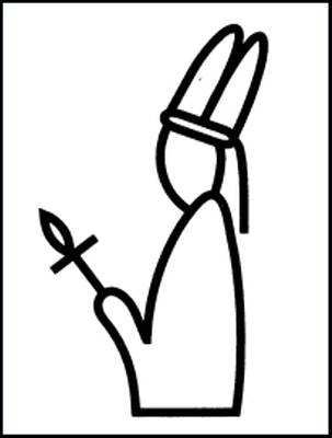 Размышляя об этой особенности карты «Верховный Жрец», мы внезапно обнаружили еще одну связь. Брат Иисуса Иаков стал первосвященником Иерусалимской церкви (движение назареев) после распятия Христа, что признается и христианскими богословами, которые называют его «мебаккером» (надзирателем), или епископом Иерусалима [98] . Известно также, что Иаков носил епископскую митру, которая ведет происхождение от короны Амона-Ра, бога-творца из египетских Фив — города, которому иудаизм обязан основами своей теологии [99] . Древнегреческий иероглиф, обозначающий бога Амона-Ра, иллюстрирует, каким образом регалии христианских епископов связаны с Фивами и Иерусалимом.