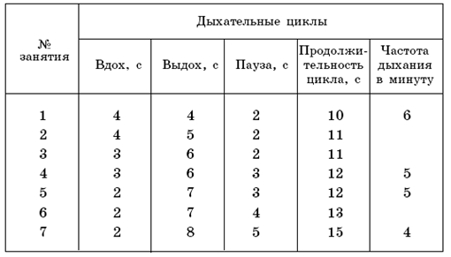 Урежение частоты дыхания для снижения МОД достигается тренингом дыхания по программе, показанной в таблице. Эти упражнения выполняются в позиции сидя, в хорошо проветренной комнате. Начинать выполнять задания нужно с первого, переходя к следующему только тогда, когда задание, которое осваивается, в течение недели будет выполняться легко, непринужденно, без усилий. Первые четыре задания нужно выполнять до 4 раз подряд, далее – до 6-7 раз, по самочувствию.