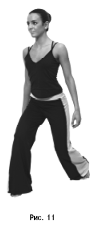 1. Левая нога впереди правой. Перенесите всю тяжесть тела на левую ногу. Правая нога слегка касается пола, как у бегуна перед стартом. Слегка согните ее в колене, отставьте назад на носок, немного обопритесь на нее для сохранения равновесия. Левая нога прямая (рис. 11).