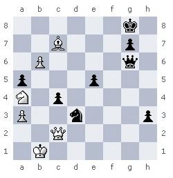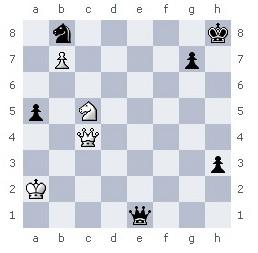 Решающий ход. Белая пешка не может продвигаться, так как она берется с шахом, а на 52. Кc3черные отыгрывают фигуру ходом 52. ... h2!, и после 53. К:e4 h1Ф+ 54. Крa2 Ф:e4белые не могут играть 55. b7из-за 55. ... Кb4+!Плохо и 53. Ф:h2 Фe1+.