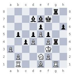 Необходимо было играть 26. h4, и если 26. ... g5, то 27. hg hg 28. Кf3 g4 29. Кg5+ С:g5(или 29. ... Крg6 30. Лh1!) 30. fg Крg6 31. Лh1!.