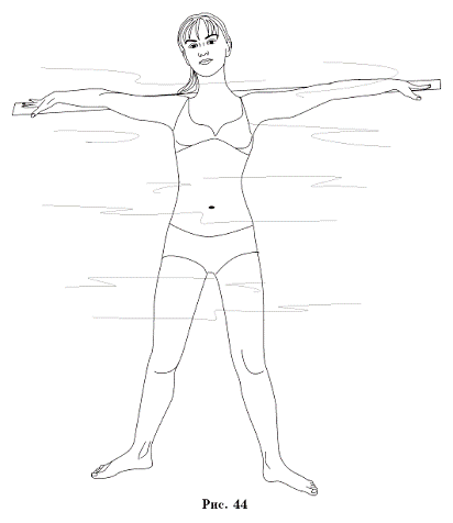 Исходное положение: стоя в воде по шею, ноги шире плеч, слегка согнуты в коленях, руки раскинуты в стороны и находятся под поверхностью воды (рис. 44).