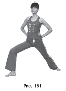 Сделайте широкий шаг-выпад вперед, нога слегка согнута. Отставленную назад ногу с приподнятой пяткой предельно вытяните и после этого прижмите стопу к полу (рис. 151).