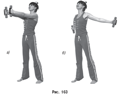 На вдохе резко разведите руки в стороны и отведите их назад (рис. 163, б).