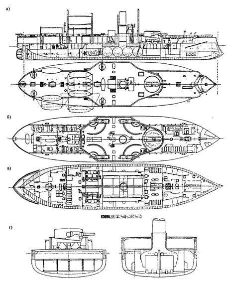 Датский броненосец «Гельголанд»: а — продольный разрез и вид сверху; б — план батарейной палубы; в — план жилой палубы; г — поперечные сечения в районе башни и мидель-шпангоута.