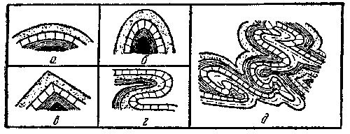 Рис. 9. Различные формы складок: а — плоская; б — крутая; в — с резким переломом; г — лежачая; д — сложная.
