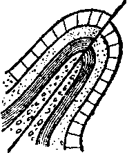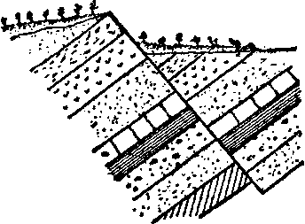 Рис. 11. Сброс. Пласты, составляющие до разрыва одно целое, заштрихованы одинаково.
