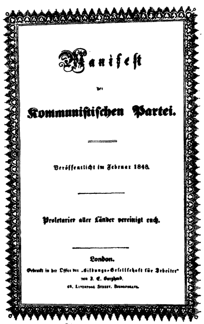 «Манифест Коммунистической партии» вышел из печати в конце февраля 1848 года. В книге было 23 страницы. Имена авторов — Маркса и Энгельса — в этом издании не были указаны.