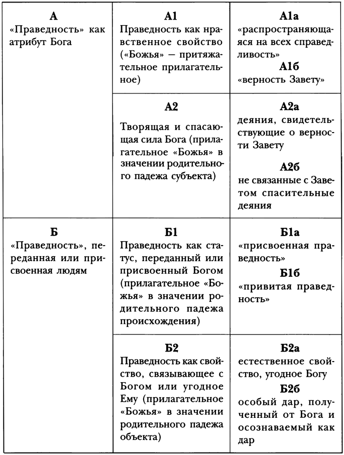 В самом общем виде исследователи Павловых текстов делятся на тех, кто понимает «Божью праведность» как атрибут самого Бога, и тех, кто подразумевает под ней статус «праведника», который Бог присваивает человеку. Мы попытаемся представить эти позиции в виде схемы, верхняя часть которой (А) отражает первую точку зрения, а нижняя (Б) — вторую. Не менее важны также и дальнейшие подразделения. Мы начнем с нижней половины, отражающей взгляды, которые разделяют отнюдь не только евангельские протестанты.