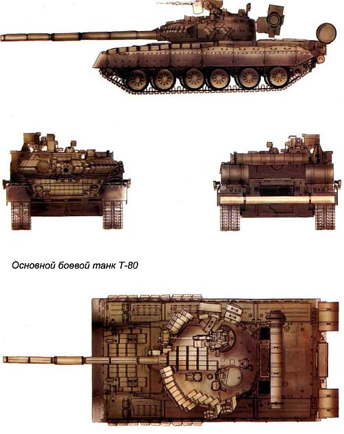 Одним из наиболее важных элементов силовой установки Т-80 является система воздухоочистки. Это объясняется тем, что газовая турбина на режиме максимальной мощности потребляет много воздуха (до 4 кг/с), скорость его потока очень высока. Естественно, что двигатель весьма чувствителен к наличию пыли в поступающем в него воздухе. Поэтому в танке Т-80 установлена система воздухоочистки высокой эффективности. В ее конструкции реализовано компромиссное решение: достигнута высокая эффективность очистки воздуха от механических частиц при минимальном сопротивлении на впуске. В состав системы входят: воздухозаборные жалюзи крыши моторно-трансмиссионного отделения с защитной сеткой, блок воздухоочистителя и масляных радиаторов; вентилятор обдува агрегатов; два вентилятора отсоса пыли и охлаждения масла; два воздуховода выброса охлаждающего воздуха и пыли; люк моторной перегородки; воздушные фильтры соплового аппарата турбины высокого давления и наддува полостей опор. Блок воздухоочистителя (одноступенчатый инерционного типа) и радиаторов установлен поперечно в моторно-трансмиссионном отделении и крепится к передней опоре моноблока. Все вентиляторы имеют привод от двигателя и установлены на передней коробке приводов. Работает система воздухоочистки в двух режимах: движение по суше и движение с ОПВТ. В первом случае воздух забирается из атмосферы над жалюзи воздухоочистителя и, пройдя через циклоны, поступает в проточную часть двигателя. При установке ОПВТ на впускные жалюзи крепят специальные кожухи, воздухопитающую трубу и газоотводящую трубу. Вместо крышки корпуса воздухоочистителя устанавливают сетку. В этом режиме поток воздуха забирается через воздухопитающую трубу и поступает сначала под левый кожух и, через соединительный патрубок, под правый, а далее — в блок воздухоочистителя, аналогично работе при движении по суше. В этом случае несколько возрастает сопротивление на впуске воздуха. Для компенсации этих потерь используется заряд из системы выбора охлаждающего воздуха и пыли, поступающий в МТО (воздуховоды выброса при этом закрыты) и забираемый вновь в воздухоочиститель и далее в проточную часть двигателя.
