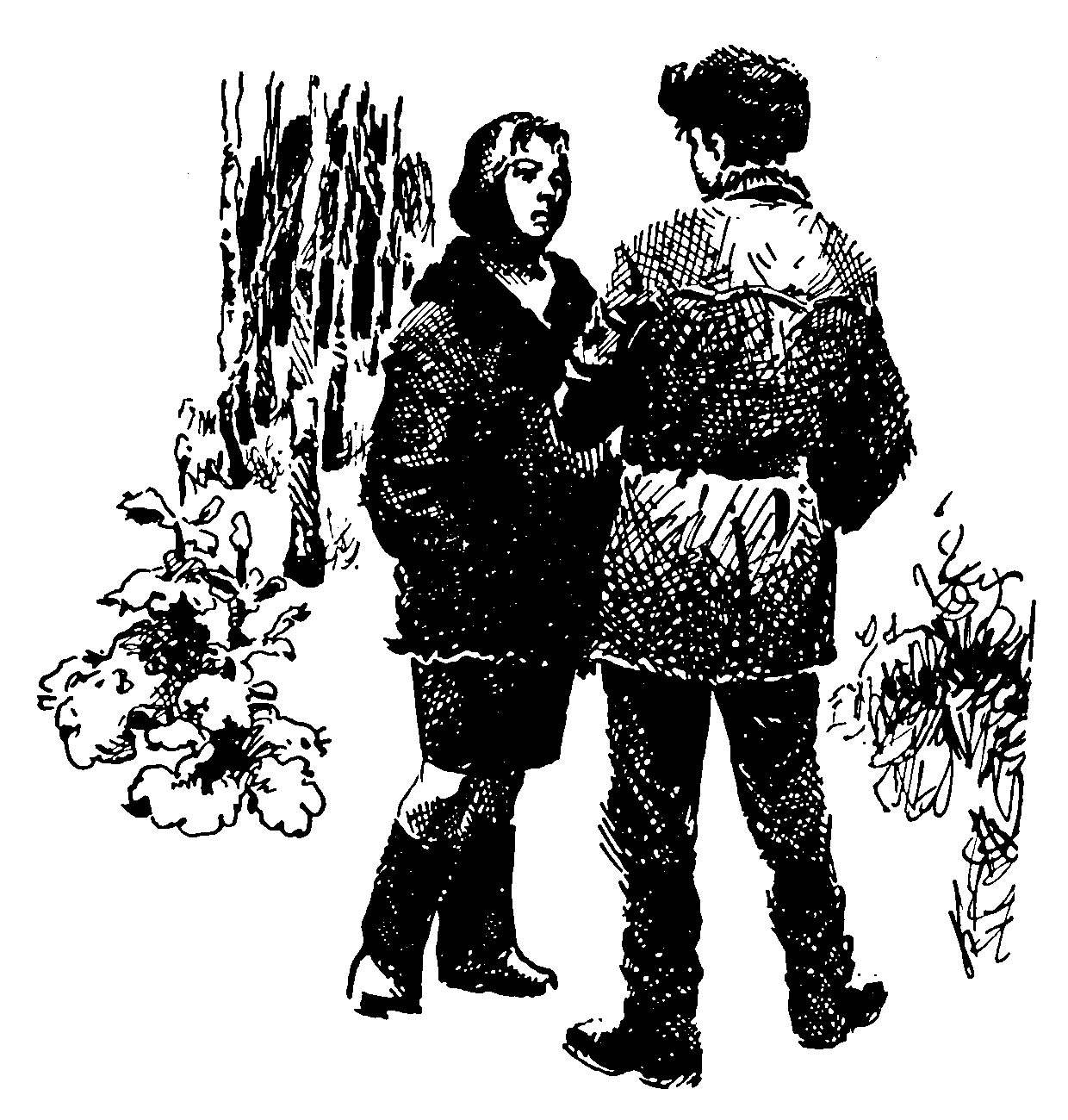 Она тревожно затихла, не ответила, отдёрнула руку и, повернувшись, медленно пошла от него по узенькой снежной тропинке.