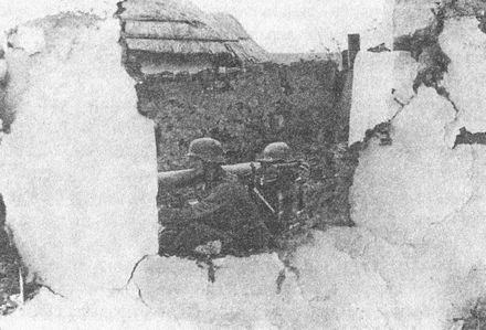— на каждый дом, группу домов или квартал, оборудованные как опорные пункты или узлы обороны, назначались специальные гарнизоны — от отделения до батальона пехоты со средствами усиления. Все прилегавшие улицы и скрытые подступы к обороняемому объекту, превращенному в опорный пункт или узел обороны, простреливали фланкирующим и косоприцельным ружейно-пулеметным огнем, дополняя его во всех случаях огнем Фаустпатронов.