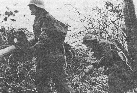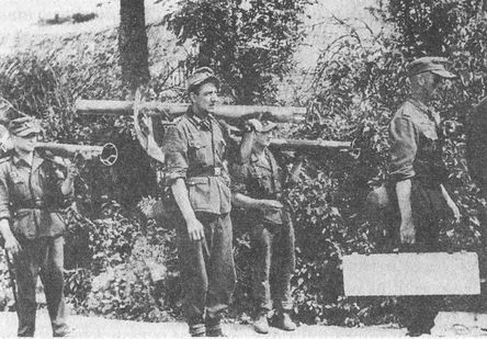 Противотанковая группа на марше. Для транспортировки Панцершрека, как правило, требовалось два человека. Один нес собственно оружие, второй коробку с зарядами к нему (август 1944 года)