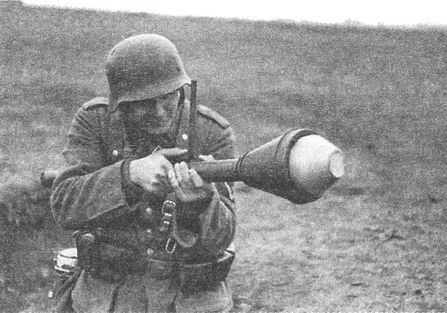 Немецкий солдат ведет стрельбу винтовочной противотанковой гранатой