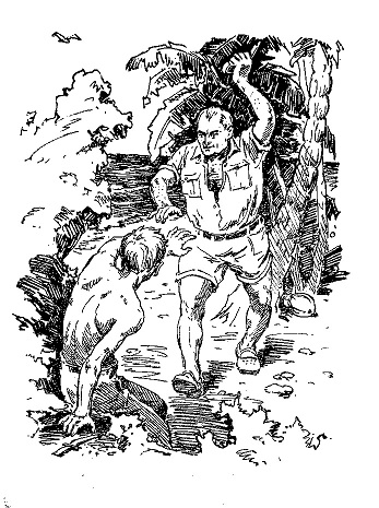 Он выбросил патрон. И опять выстрела не последовало, только что-то скрипнуло в пистолете. Бормоча ругательства, он стал вытаскивать обойму, -Я нагнулся, схватил горсть песку и швырнул ему в глаза. Он закрыл глаза рукой и старался снова зарядить обойму, а я все швырял и швырял ему в лицо белый коралловый песок. Все-таки ему удалось справиться с обоймой, и опять пистолет не выстрелил. Видно, заржавел спусковой механизм или в него набился песок. Поняв это, капитан стал гоняться за мной вокруг палатки и между пальмами. Но тут преимущество было явно на моей стороне. Я легко увертывался от него, и несколько раз угодил в него кусками коралла. У него был рассечен лоб и щека. Наконец он остановился, тяжело дыша и пожирая меня ненавидящим взглядом.