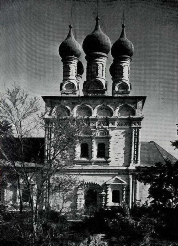 К этому же времени относится и последняя перестройка Успенского собора XV в. в кремле, который, как уже упоминалось, в XVIII в. был переименован в Христорождественский. Проект его был выполнен в 1826 г. талантливым архитектором Стефенгагеном в формах классицизма. Стены собора были несколько повышены и завершены широким барабаном с аттиком и обьгчным для построек этого стиля низким куполом, на котором был еще один очень узенький барабан с главкой и крестом. К собору была с запада пристроена трапезная с коринфским портиком, увенчанным фронтоном. Портик был позднее несколько расширен, но сохранил первоначальные хорошо прорисованные и выполненные детали (илл. 44). Сейчас и трапезная, и собор, и фронтоны портика искажены перестройками 1873 г.