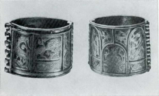 Замечательным примером ювелирного гравировального мастерства являются браслеты (наручи) клада 1966 г. (Рязань, Краеведческий музей), сделанные из широких серебряных пластин, на которых на фоне черни выгравированы птицы, грифоны и танцовщица с двумя музыкантами (илл. 4, 5). Края браслетов украшены позолотой и рубчатой проволокой; такой же проволокой разделены изображения. Стиль и общие особенности рисунка заставляют предполагать здесь киевскую работу XII-XIII вв.