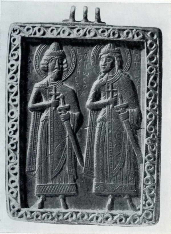 Высокими художественными достоинствами отличалась и резьба по камню. Деисус на шифере, найденный в Старой Рязани (сохранилась только левая половина – 120x93 мм), следует датировать XII в. Он выполнен выпуклым одноплановым рельефом и является пока наиболее древним образцом такой резьбы. Фронтальное положение фигур с поставленными врозь носками ног, относительно традиционный тип изображения Христа и Марии вызывают здесь отчетливые ассоциации с византийскими, притом их архаизирующими образцами. Однако болынеголовость фигур и преувеличенные пропорции правой руки Марии, что было вызвано желанием подчеркнуть жест богоматери, как и другие особенности, говорят о местном мастере.