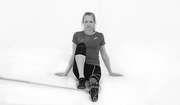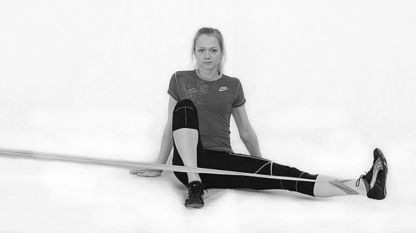 И.П. сидя боком к неподвижной опоре, за которую зафиксирован один конец резинового амортизатора, другой конец закреплен за нижнюю часть голени или стопу со стороны неподвижной опоры, приводить ногу с резиновым амортизатором, затем максимально отводить в сторону, при этом нога прямая, другую можно согнуть.