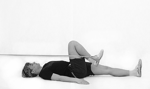 При выполнении этого упражнения возможны болезненные ощущения в области внутренней зоны колена. Это нормальная реакция мышц, прикрепленных к этой области и долгое время не работающих. В случае сохранения болезненности во время выполнения упражнения надо приложить компресс со льдом на 10–15 секунд. Постарайтесь выполнить это упражнение не менее 10–15 повторов в одном подходе. То же с другой ногой (даже в случае здорового коленного сустава). Усилие можно уменьшать или увеличивать, меняя исходное положение, располагаясь ближе или дальше от точки крепления амортизатора, а также увеличивая или уменьшая количество резиновых амортизаторов. Но необходимо помнить: чем больше угол отведения ноги в сторону, тем больший эффект дает это упражнение.