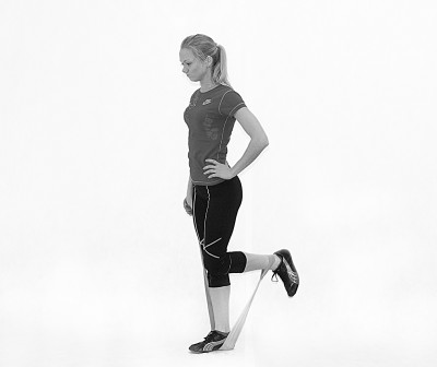 Один из вариантов выполнения этого упражнения можно воспроизводить из И.П. стоя на одной ноге, боком к неподвижной опоре, к которой фиксируется резиновый амортизатор, но при этом необходимо фиксировать амортизатор как можно выше (выше роста человека).