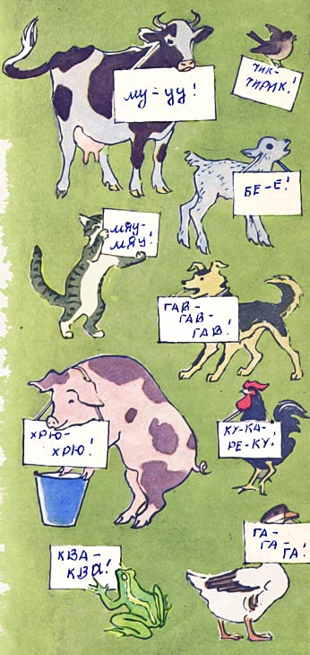 — Вы опять напутали! Корова не квакает! Петух не мяукает! Не кричат они так!