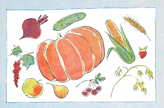 — Не может быть! — усомнился знаменитый художник. — А ну ответьте: где здесь тыква? Где яблоко? Где груша? Где вишня? Где кукуруза? Где овёс? Где свёкла? Где клубника? Где пшеница? Где красная смородина? Где огурец?
