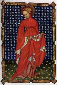 «Дама» (на илл. изображение из рукописи, хранящейся в Библиотеке Эстенсе в Модене) наделялась в любовной лирике позднего Средневековья ярко выраженным символическим смыслом, и как и Деву Марию, ее считали проводником мужчины между Землей и Небом.