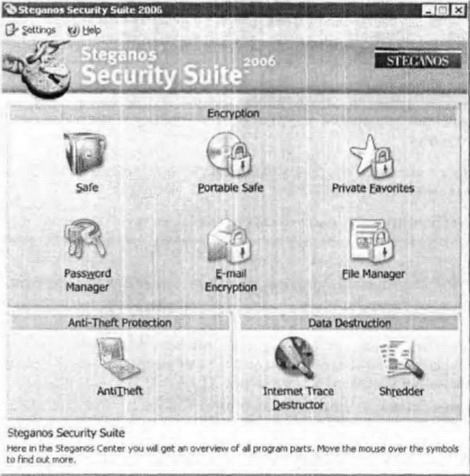 Программный пакет Steganos Security Suite ориентирован на скрытие личной информации от чужих глаз. Он состоит из семи утилит, каждая из которых предназначена для защиты данных определенного вида.