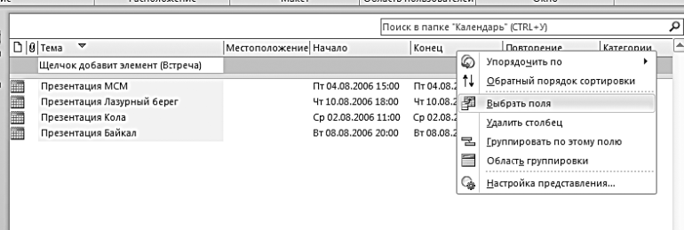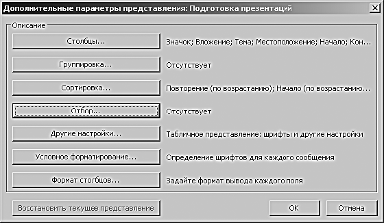 Чтобы настроить табличное представление, нужно знать, по какому признаку Outlook отберет в него интересующие вас сейчас встречи. Например, по синей метке «жесткое планирование» или по слову «тренинг» в поле «Тема». Будем считать, что ваши мероприятия, требующие подготовки, относятся к какому-то определенному типу (тренинг, командировка, выставка) и это слово обязательно присутствует в названии встречи. Разберем настройки на примере подготовки презентации.