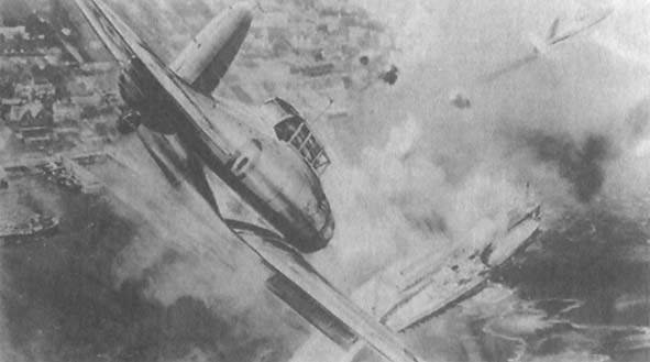 Картина, достаточно точно изображающая первую успешную атаку пикировщиков во Второй Мировой войне, когда «Скуа» ВСФ потопили в гавани Бергена германский легкий крейсер «Кенигсберг».