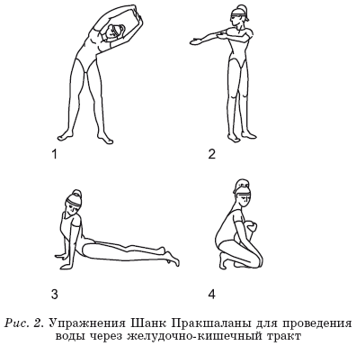 Не поворачивая верхнюю часть туловища, наклониться сначала влево, не задерживаясь в конечном положении, выпрямиться и немедленно наклониться вправо. Повторить 4 раза это двойное движение, то есть совершить 8 наклонов, попеременно влево и вправо, что займет в общей сложности около 10 секунд. Эти движения открывают привратник желудка и при каждом движении (наклоне) часть воды проникает в двенадцатиперстную кишку из желудка.