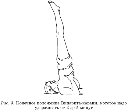 Випарита-карани. Лечь на спину на пол, под голову ничего подкладывать нельзя. Ноги вытянуты, руки по бокам, ладони прижаты к полу. Медленно поднять ноги примерно до угла в 30° и задержаться в этом положении. Отталкиваясь руками от пола, поднять ноги до вертикального положения. Задержаться в нем в течение нескольких секунд. Продолжить подъем, наклоняя ноги на себя, оторвав от пола таз.