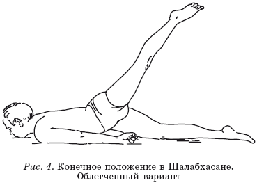 Шалабхасана. Лечь на пол вниз лицом, вытянуть позвоночник, подбородок опустить на пол, руки положить вдоль туловища. Сжать руки в Ваджра-мудру – символ молнии – кулаки с вложенными внутрь большими пальцами. Поставить кулаки на пол вертикально большими пальцами вниз. Руки в локтях можно чуть-чуть согнуть. Вдохнуть и с медленным выдохом, отталкиваясь от пола руками, вытягивающим назад-вверх движением поднять как можно выше прямую правую ногу. Вдохнуть, затем опустить ногу. Проделать то же самое с другой ногой. Повторить еще 2 раза. Затем поднять обе ноги. Схема дыхания та же. Повторить еще 2 раза.