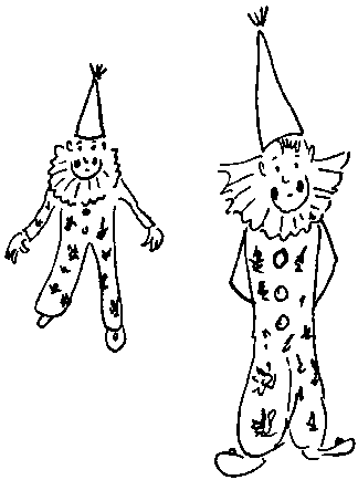 Из ситца с желтыми и красными цветами мама сшила мне клоунский костюм. Из гофрированной бумаги сделала воротник — жабо, из картона — маленькую шапочку с кисточкой, на тапочки пришила помпоны.