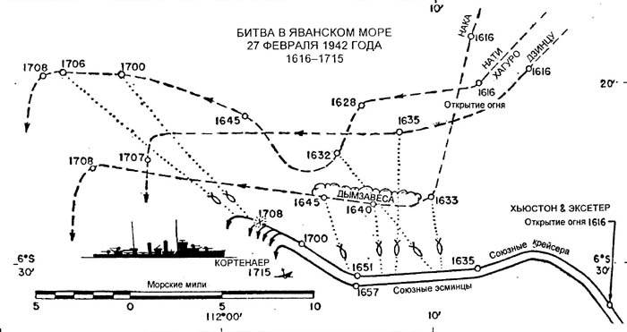 “Эксетер”, все еще пылая, двигался почти прямолинейно курсом SO-t-S. К 17.00 он оказался самым крайним кораблем на левом фланге соединения. 4 американских эсминца пересекли его кильватерную струю и образовали завесу для основной колонны крейсеров. Далее к югу “Перт” и “Ява” сначала повернули на 90° на запад, но потом, выстроившись в кильватер, повернули назад. “Хьюстон” и “Де Рейтер”, описав полный круг, присоединились к ним. Теперь в колонне оказались 4 крейсера. Было восстановлено некое подобие порядка. Эскадра теперь состоялаиз двух групп. В левую входили: подбитый “Эксетер” и эсминцы “Витте де Витт”, “Юпитер”, “Энкаунтер”, “Электра”, образовавшие завесу по левому борту “Эксетера”. В 10000 ярдов впереди и в 6000 ярдов правее них шли “Де Рейтер”, “Перт”, “Хьюстон” и “Ява”. Эту колонну слева прикрывали 4 американских эсминца. Обе колонны сохраняли курс SO-t-S до 17.13.