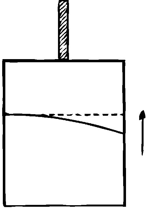 Внешний наблюдатель, который считает, что лифт находится в ускоренном движении, утверждал бы: световой луч входит в окно и движется горизонтально вдоль прямой с постоянной скоростью по направлению к противоположной стене. Но лифт движется вверх, и за время, в течение которого свет доходит к стене, лифт изменит своё положение. Поэтому свет упадёт в точку, расположенную не точно напротив точки его входа, а немного ниже (рис. 72). Смещение будет очень небольшим, но тем не менее оно существует, и световой луч проходит относительно лифта не вдоль прямой, а вдоль слабо искривлённой линии. Это вызвано тем, что за то время, пока луч проходит внутри лифта, сам лифт смещается на некоторое расстояние.