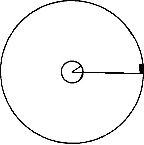 Представим себе большой диск с двумя концентрическими окружностями, нарисованными на нём; одна из этих окружностей мала, другая очень велика (рис. 73). Диск быстро вращается. Он вращается относительно внешнего наблюдателя; пусть имеется ещё внутренний наблюдатель, помещающийся на диске. Предположим далее, что система координат внешнего наблюдателя инерциальна. Внешний наблюдатель может нарисовать в своей инерциальной системе две такие же окружности — малую и большую, покоящиеся в его системе, но совпадающие с окружностями на вращающемся диске. Евклидова геометрия справедлива в его системе координат, так как его система инерциальна, — так что отношение длин окружностей равно отношению радиусов. А что же находит наблюдатель на диске? С точки зрения классической физики, а также специальной теории относительности его система координат недопустима. Но если мы стремимся найти новую форму физических законов, справедливую в любой системе координат, мы должны рассматривать наблюдателя на диске и наблюдателя внешнего с одинаковой серьёзностью. Теперь мы извне следим за попыткой внутреннего наблюдателя найти путём измерения длины окружностей и радиусов на вращающемся диске. Он использует такой же небольшой измерительный масштаб, какой был использован внешним наблюдателем. «Такой же» означает либо действительно тот же, просто переданный внешним наблюдателем внутреннему, либо один из двух масштабов, имеющих одинаковую длину в покоящейся системе координат.