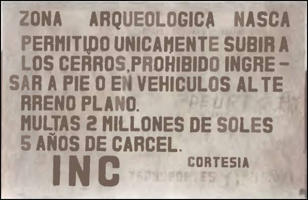 Нарушителей этого запрета ожидают суровые кары: штраф в 1 миллион долларов США и тюремное заключение сроком до пяти лет. Признаться, мне трудно представить что-либо менее привлекательное, чем перуанская тюрьма. А преодолевать пешком многокилометровый путь по раскаленной пустыне — занятие не самое приятное. Площадь плато поистине огромна, да к тому же над ней часто совершает облеты патрульный самолет. Кроме того, одинокого пешехода, плетущегося по пескам пустыни, мигом заметят с борта самолета, на котором туристы каждый день с утра до ночи совершают полеты над полосами-геоглифами. Пилотам дано строгое предписание немедленно сообщать по рации о всяком замеченном самолетике, автомобиле, группе или отдельном путнике. На стратегических пунктах, например на обзорной вышке, постоянно несут вахту дежурные. Двое мотоциклистов мигом перехватят и остановят непрошеного гостя.