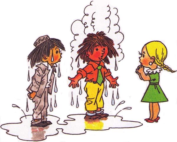 Незнайка пошел и через минуту вернулся тоже с головы до ног мокрый. Вдобавок от него валил кверху пар, так как он включил сразу горячую воду.