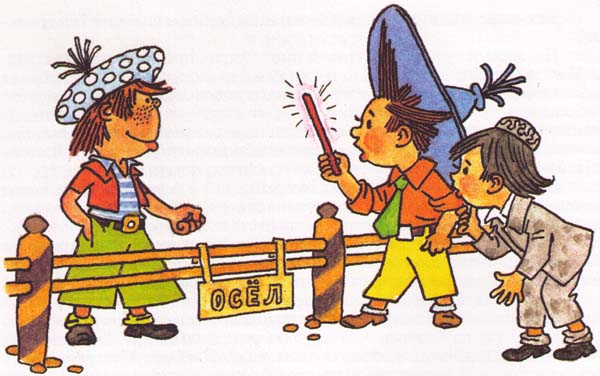 Пока они разговаривали, осел вышел из сарая и направился прямо к ним. Незнайка поскорей замахал у него перед носом палочкой: