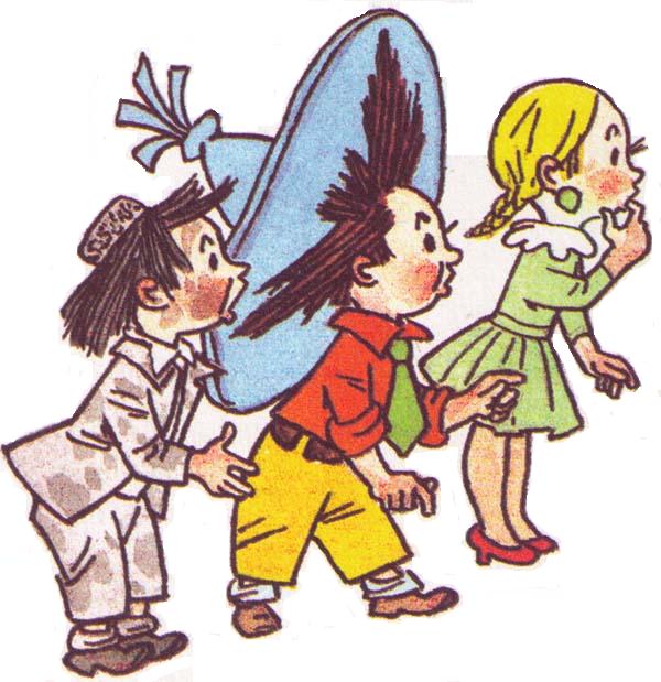 Некоторое время Незнайка, Кнопочка и Пестренький без оглядки бежали по улице. Вскоре они увидели, что за ними никто не гонится, и пошли не спеша. Кнопочка тут же принялась стыдить Незнайку.