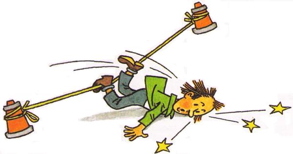 Выйдя от Шутилы и Коржика, милиционер Свистулькин зашагал по улице, с недоумением оглядываясь по сторонам и не понимая, где он находится. Спустя некоторое время он разобрал, что идет по Макаронной улице, но не в направлении к своему дому, а в противоположную сторону. Он уже хотел повернуть обратно, но решил немножечко прогуляться и подышать свежим воздухом. Это решение оказалось для него роковым. Не успел он сделать и десяти шагов, как споткнулся о натянутую поперек тротуара веревку и полетел с ног. Падая, он сильно ушибся о тротуар лбом и остался лежать неподвижно.
