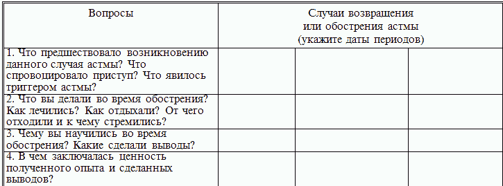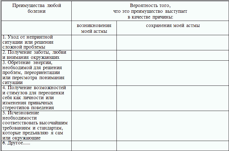 Для того чтобы работа по выяснению причин преимуществ вашей бронхиальной астмы оказалась успешной, рекомендую предварительно вспомнить особенности того жизненного периода, который вы переживали непосредственно перед возникновением заболевания. Скорее всего он был весьма трудным, и для того чтобы преодолеть эти трудности, вам не хватало либо собственных сил и времени, либо помощи окружающих, либо еще чего-нибудь важного. Теперь представьте, что болезнь оказалась для вас благом, позволившим вам «на законных основаниях» преодолеть неприятную ситуацию. Так в чем же заключались преимущества, которые давала вам ваша болезнь?