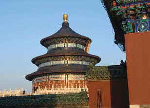 В Китае почти нет круглых построек. Согласно китайскому устройству мира, небо круглое, а земля квадратная. И поэтому на земле место земному, а на небе небесному, и только Храм Неба это кусочек неба на земле. Одна из стен храмового комплекса сделана круглой. И самое красивое и самое фотографируемое здание храма — великолепный «Зал жатвенных молитв» Циняньдянь — имеет круглую форму.