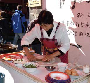 Традиционная еда народности наси, преобладающей в Лицзяне, проста. В основе ее лежит традиционный хлеб «баба», напоминающий индийский наан. На каждом углу продаются «наси сэндвичи» — хлеб с огурцами и овечьим сыром внутри.