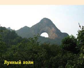 Проедем еще немного на велосипеде — и мы у Лунного Холма. На его вершине находится скала с полукруглым 50-метровым отверстием внутри, напоминающим месяц, отсюда и название. С разных точек отверстие видно по-разному — иногда это почти полная луна, иногда половинка, иногда лишь тонкий месяц. Оставим внизу велосипеды, заплатим 15 юаней, и пойдем вверх по каменным ступенькам. Высота холма 380 метров, и ступеней около 800, но они удобно расположены и подъем совсем нетяжелый. Вдоль всего подъема стоят старушки, продающие холодную воду.