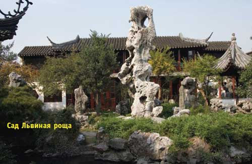 Дзэн-буддийский монах Тянь Лу создал этот сад в честь своего учителя Чжун Фэна в 1342 году. В этом небольшом саду потрясающее ощущение покоя и гармонии, создаваемое мастерски расположенными искусственными горами, домиками вокруг озера, водопадом и скалами на западной стороне озера. Часть рукотворных гор была сделана еще в XIV веке. Горы похожи на большой лабиринт с извилистыми дорожками, пещерами, старыми большими соснами и кипарисами. Сами горы и большие камни причудливых форм, разбросанные по саду, похожие на львов в причудливых позах — спящих, дерущихся, стоящих на задних лапах, даже танцующих — создают ощущение сказки в этом замечательном образце умелого сочетания искусственного дизайна и живой природы. Весь сад выдержан в едином стиле с оттенками дзэн-буддизма и заслуженно считается вершиной садостроительного мастерства.