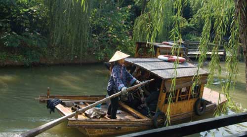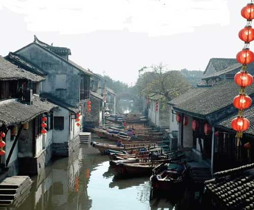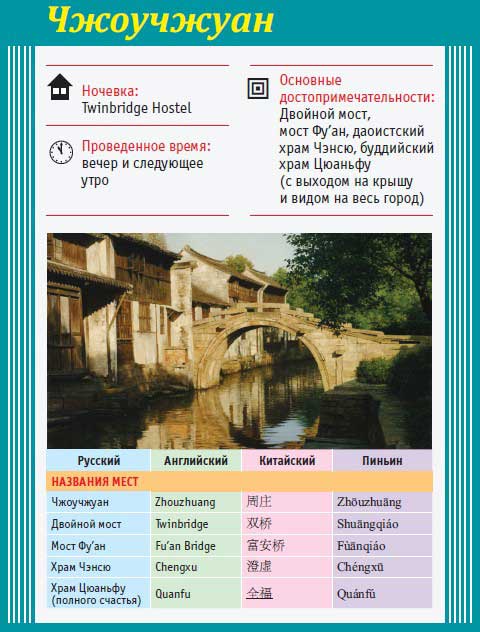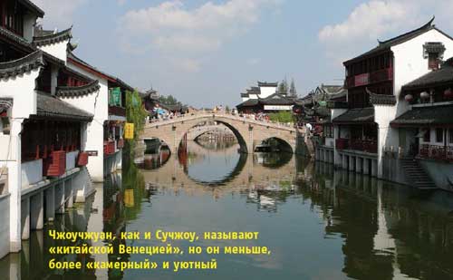 Если есть время и силы, то существует еще один интересный вариант: можно не возвращаться сразу в Шанхай, а поехать из Сучжоу на автобусе в город Чжоучжуан — самый старый город на воде в Китае. Чжоучжуан, как и Сучжоу, называют «китайской Венецией», но он меньше, более «камерный» и уютный. Город, по китайским меркам, совсем молодой, ему всего 900 лет. В Чжоучжуане есть несколько интересных храмов, но главная его прелесть — это красота и легкая, расслабленная атмосфера каналов, домов на воде, причалов у каждого домика, узких аллей.