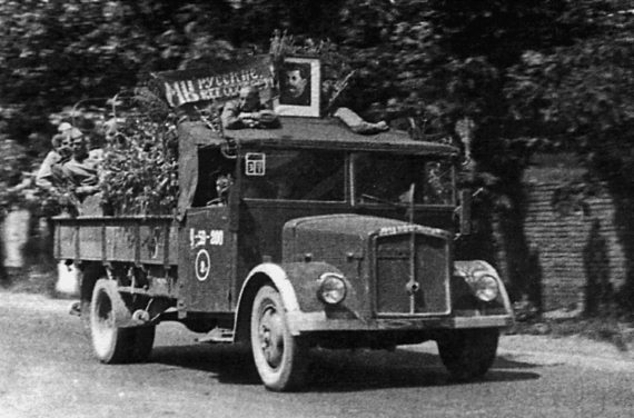 Трофейный заднеприводный 2,5-тонный «Крупп-LD2,5H42» (4х2) образца 1935 года с дизелем воздушного охлаждения мощностью 45 л. с. в Красной Армии. Чехословакия, май 1945 года. Надпись на транспаранте рядом с портретом И. В. Сталина гласит: «Мы, русские, все одолеем!»
